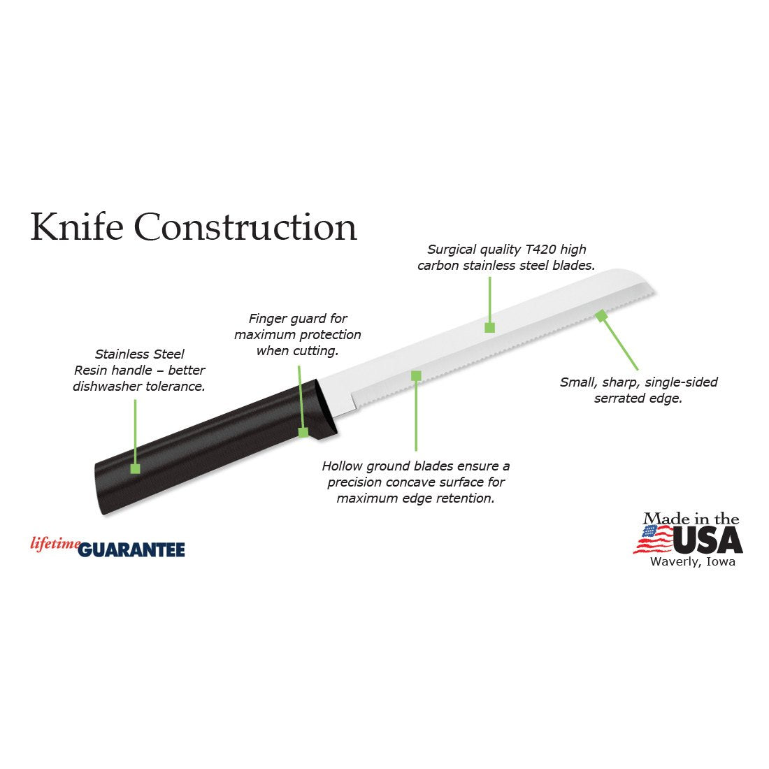 Bread loaves, hoagie buns, pound cakes and more can be sliced without crumbling or squishing, courtesy of the 6" blade's surgical-quality and razor sharp serration. The tooth-edge effortlessly glides through thick, crusty breads as easily as it does soft,fluffly ones. Try it on fibrous vegetables such as cabbage or celery, or on tough skinned fruit like pineapple.