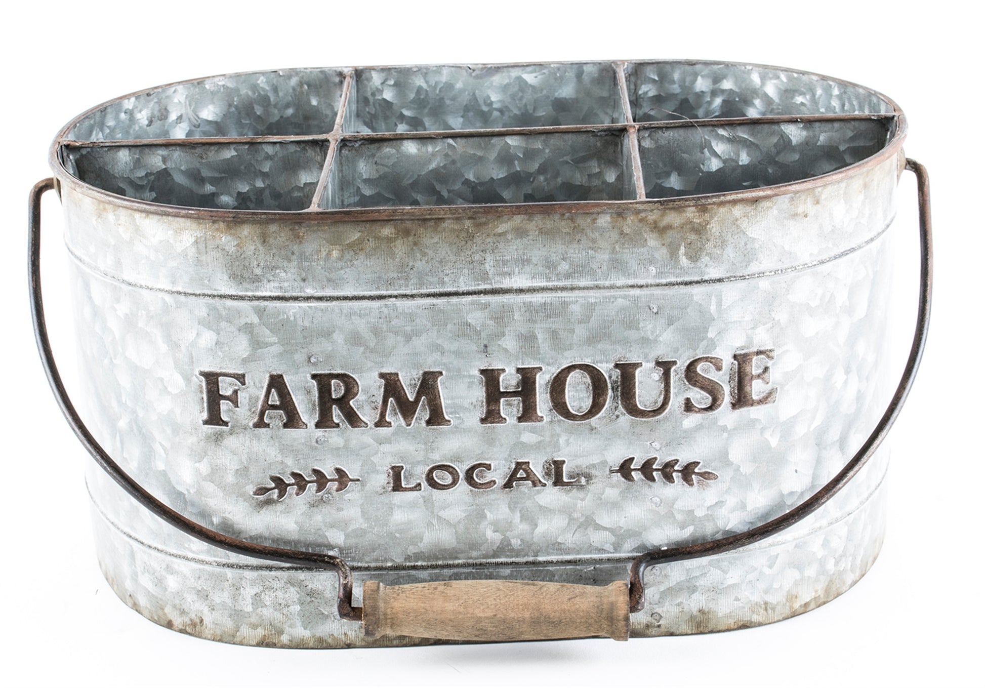 Galvanized divided bucket had 6 interior sections. Use it for silverware, kitchen organizer, planter for herbs, etc. Measures 12.6" L x 12.4" W