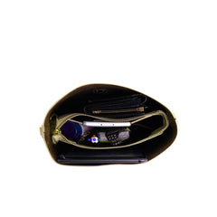 - Inside zippered compartment has a zipper pocket and an open pocket