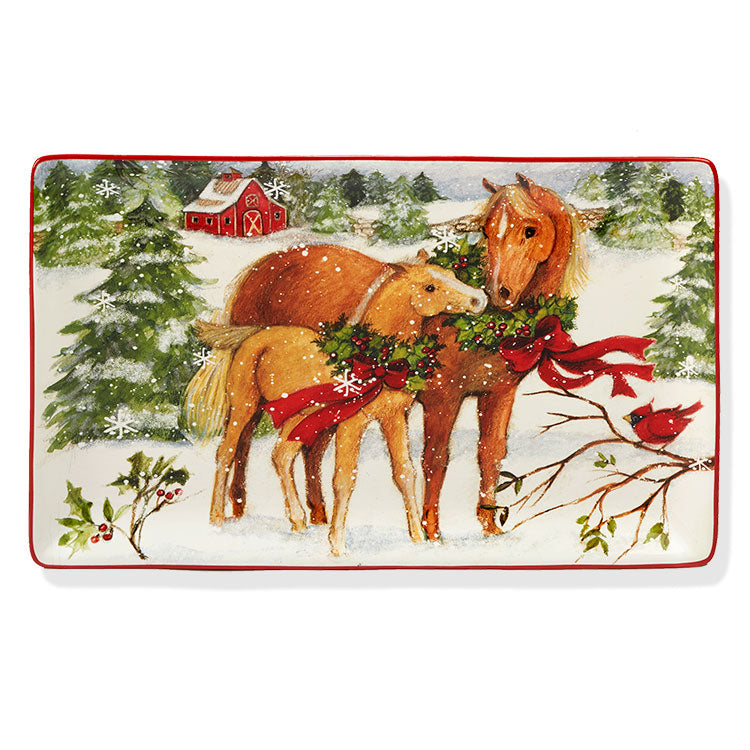 Ceramic rectangular holiday platter features a beautiful rendition of a mare and foal all decked out for the holidays.