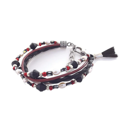 Classy! Dual strands of classic white freshwater pearls, ruby colored seed beads, jet black cones compliment the ebony strand of braided Authentic Horse Hair. Red and white leather cord and a petite horse hair tassel finish off the layers. Adjustable from 6.5 to 9.5 inches with a lobster claw and chain closure. Harness your passions!