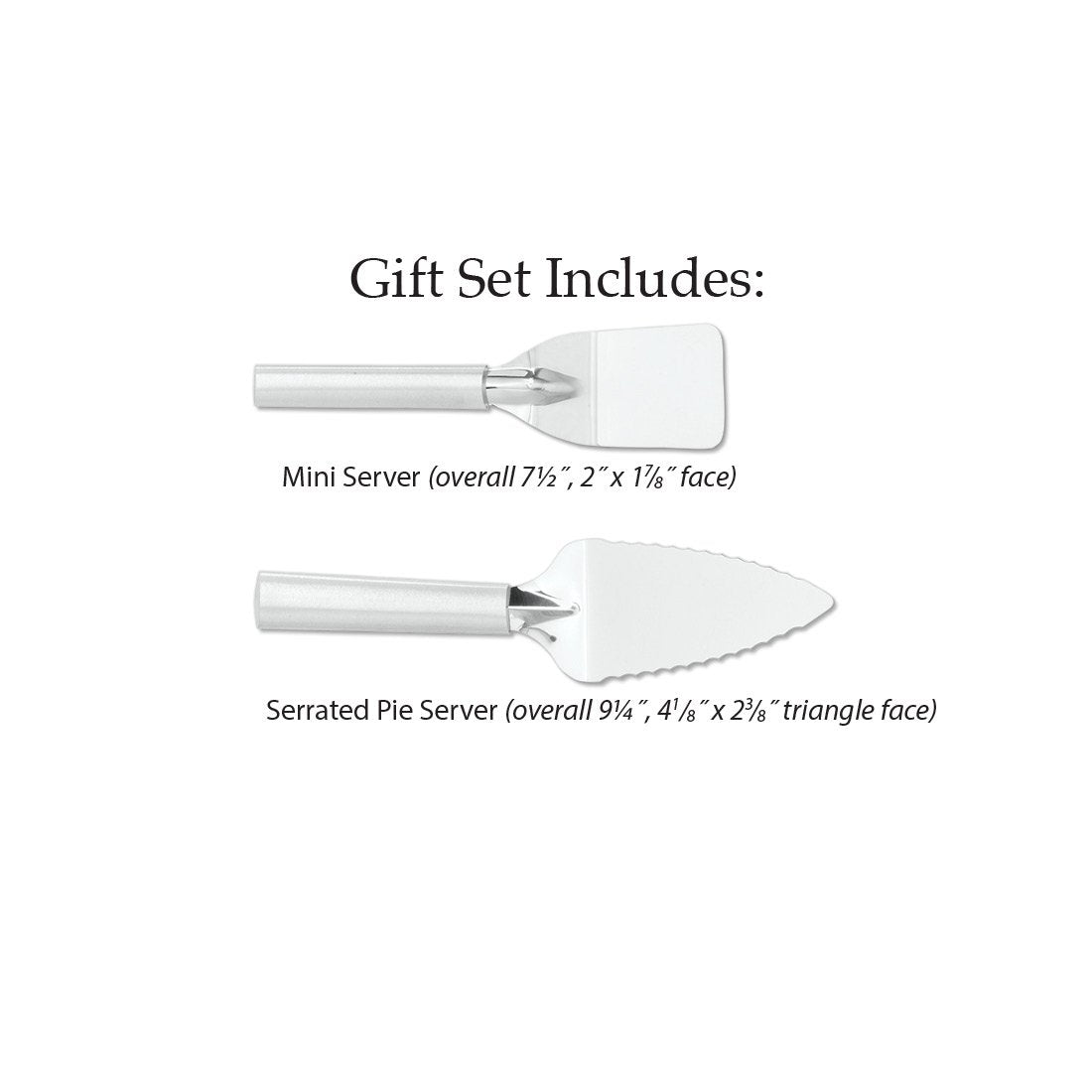 The Serving Gift Set features two of the most useful kitchen utensils, the Mini Server and the Serrated Pie Server. Mini server features an angled face perfect for serving from casserole pans or cake sheets. The Serrated Pie Server features a serrated edge that cuts through pies, cakes, bars and more.